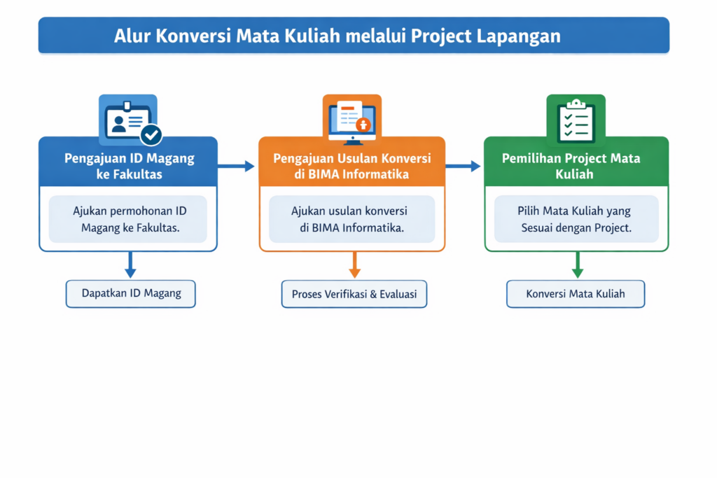 Mahasiswa mengajukan usulan konversi mata kuliah melalui sistem BIMA Informatika, dengan melampirkan detail kegiatan project yang diikuti hingga Klaim step klaim nilai Konversi: Mahasiswa memilih mata kuliah yang akan dikonversi berdasarkan kesesuaian antara capaian pembelajaran mata kuliah dengan aktivitas dalam project lapangan. Semua persetujuan konversi dari Project Lapangan, berdasarkan penilaian kelayakan dan approval dosen pembimbing lapangan.